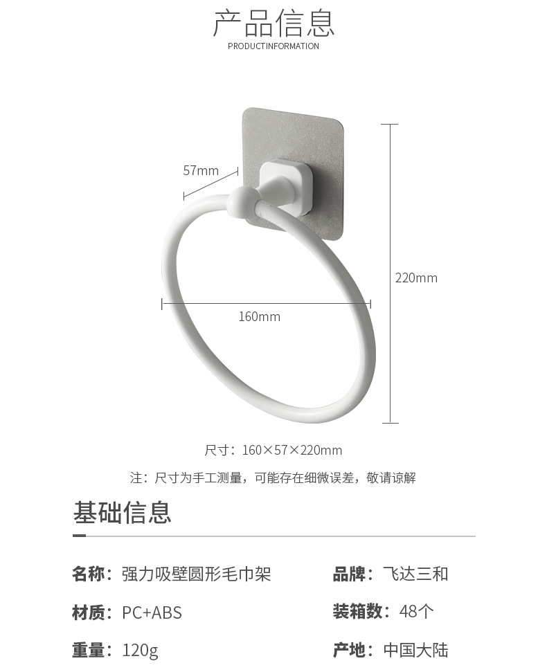 品牌名稱(chēng):飛達三和 生產(chǎn)地區:中國·浙江·臺州 產(chǎn)品貨號:R5480 裝箱數:48 產(chǎn)品尺寸:16*5.7*22cm 外箱尺寸:57*40.5*45.5cm 條形碼:6931643818797 飛達三和R5480 強力吸壁圓形毛巾架